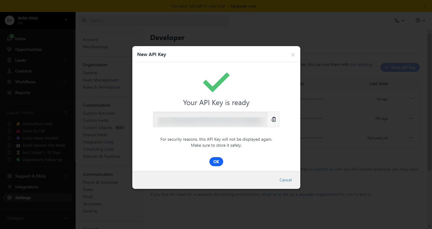 Step 3:- Go to Settings, then select API Keys and create a new key.