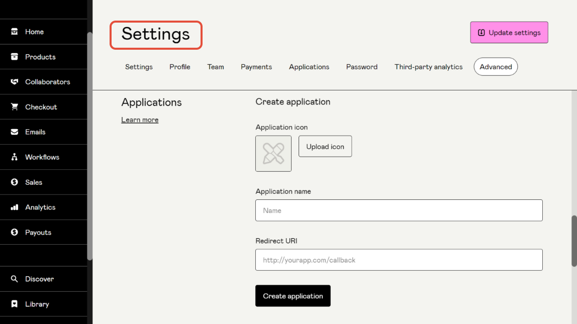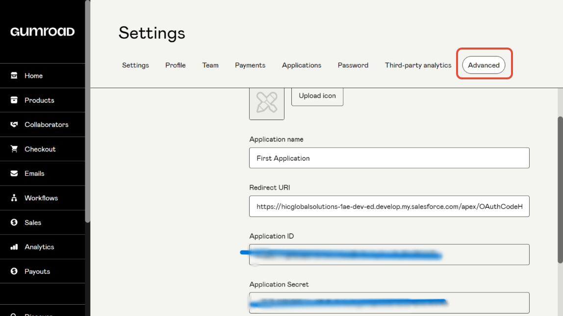 Step 4:- After navigating to Settings go to Advanced > Applications. Gumroad supports OAuth 2.0. You will receive a Client key and Client secret. Ensure to mention the Callback URL in the redirect URL field.