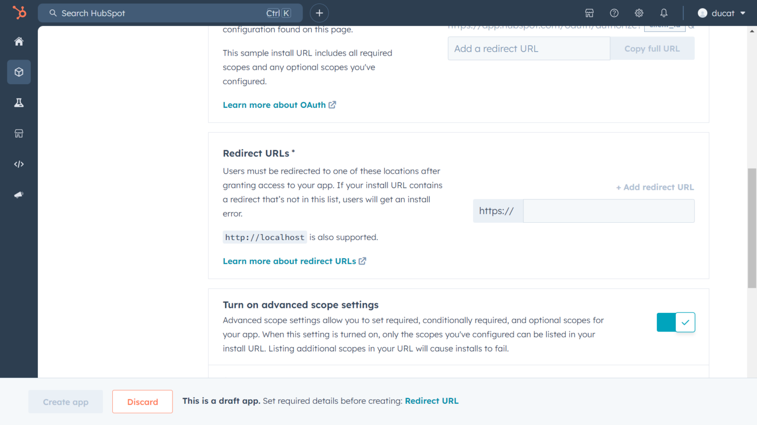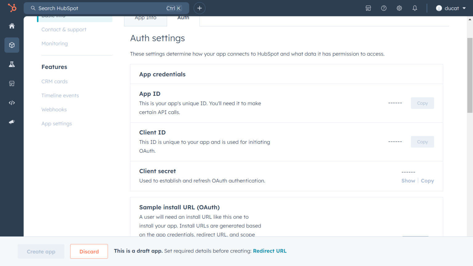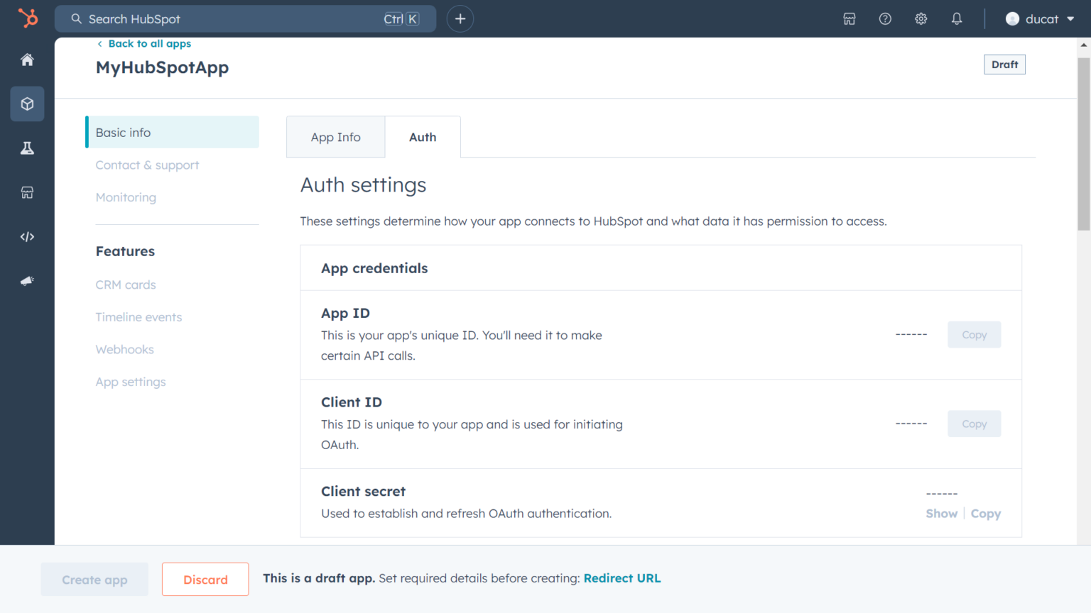 To generate your API credentials, you must first register an application. Use the following link to complete the registration HubSpot App Registration.
