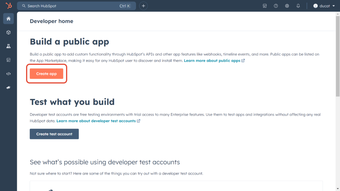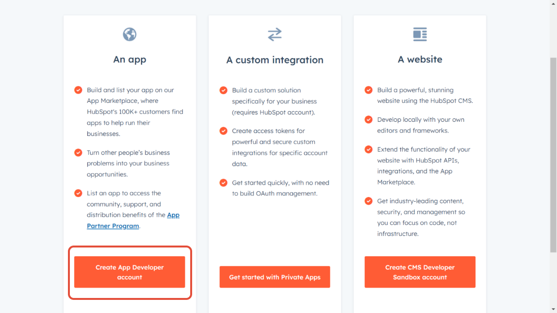 Step 4:- After completing your HubSpot registration:- Click on Create App Developer Account.