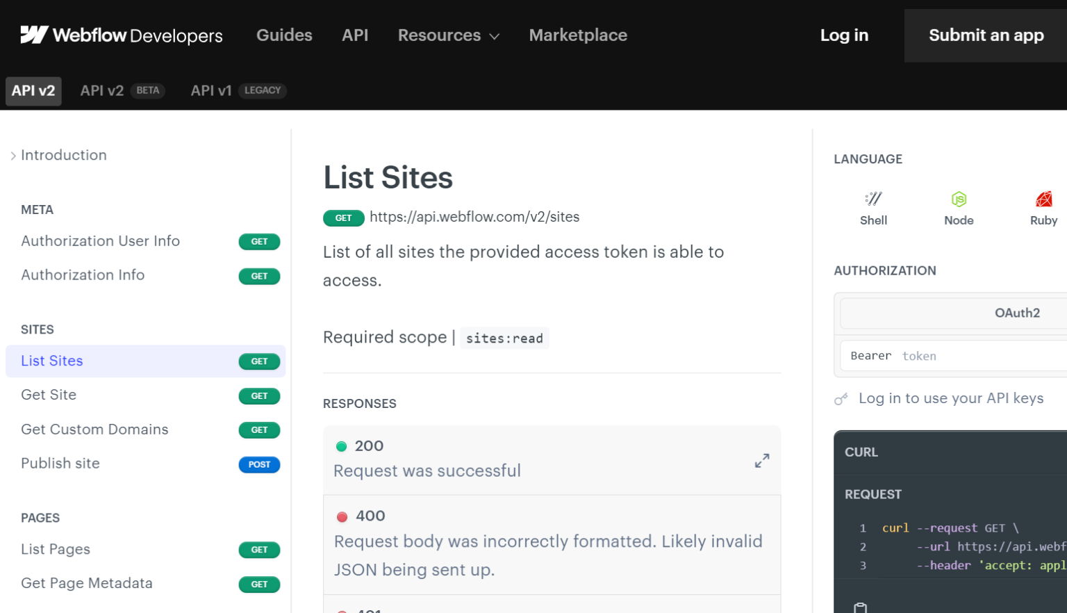 Step 5 :- Now this is the Api Reference where you will find all the rest api of Webflow.