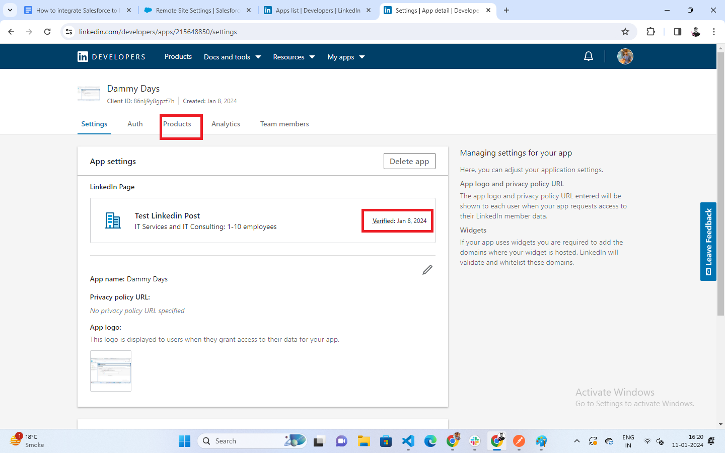 Step 5:- In the Product tab, request access for “Share on LinkedIn” and “Sign In with LinkedIn” using OpenID Connect