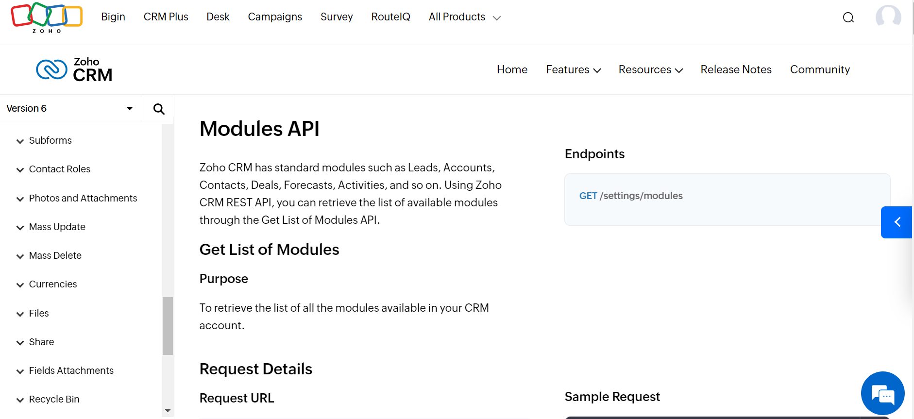 Reference Link for your API Request : Reference Link for your API Request : https://www.zoho.com/crm/developer/docs/api/v6/modules-api.html
