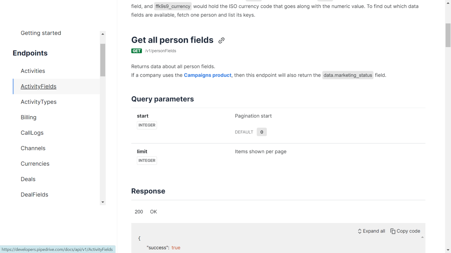 Step 7:- Obtain the API link to retrieve data. Refer to the Pipedrive documentation for Person Fields: