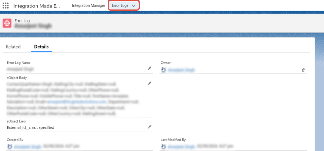 If any errors occur while syncing data into Salesforce, you can review them in the Error Logs tab.
